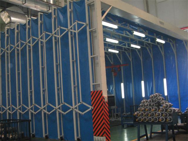 伸縮噴漆房通常采用多組可移動的框架有成平行四邊形狀的連桿連接而成,再點擊的驅動下帶動整個前室伸縮移動,框架之間由阻燃PVC布密封,行程一個隔離的獨立工作間,避免噴漆工作的車間環(huán)境污染。