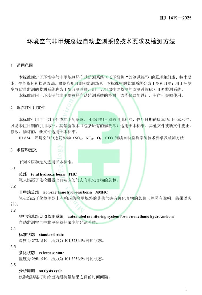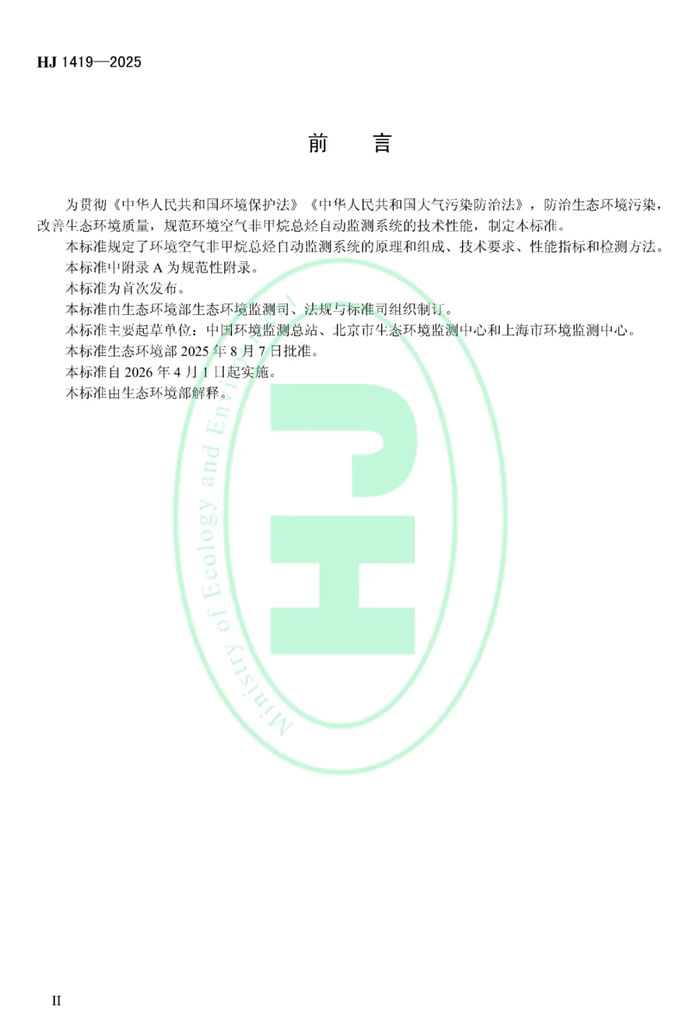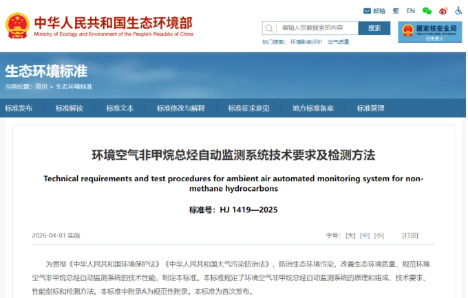 為貫徹《中華人民共和國環(huán)境保護(hù)法》《中華人民共和國大氣污染防治法》,防治生態(tài)環(huán)境污染,改善生態(tài)環(huán)境質(zhì)量,規(guī)范環(huán)境空氣非甲烷總烴自動監(jiān)測系統(tǒng)的技術(shù)性能,生態(tài)環(huán)境部制定國家生態(tài)環(huán)境標(biāo)準(zhǔn)《環(huán)境空氣非甲烷總烴自動監(jiān)測系統(tǒng)技術(shù)要求及檢測方法(HJ 1419—2025)》。本標(biāo)準(zhǔn)為首次發(fā)布,自2026年4月1日起實(shí)施。