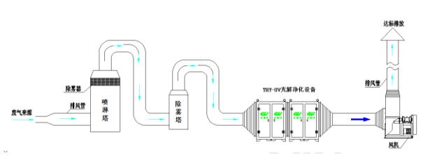 橡膠廢氣處理需要考慮運營成本及安全性,方案工藝路線擬采用以“通風(fēng)系統(tǒng)(風(fēng)機、收集罩、管道)+預(yù)處理系統(tǒng)(凈化塔+除霧器)+核心凈化系統(tǒng)(UV光解凈化設(shè)備)”為核心工藝來處理該橡膠廢氣。橡膠廢氣處理工藝流程圖如下